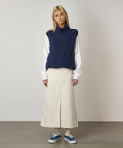 Going to ankle length, this long skirt is characterized by its large pockets on both sides and its elongated slit in the centre front. It has an elastic waistband (the belt and belt buckle are fake). It is made of durable, firm, organic cotton twill that can withstand strenuous movement and is dyed to give it an atmospheric look.